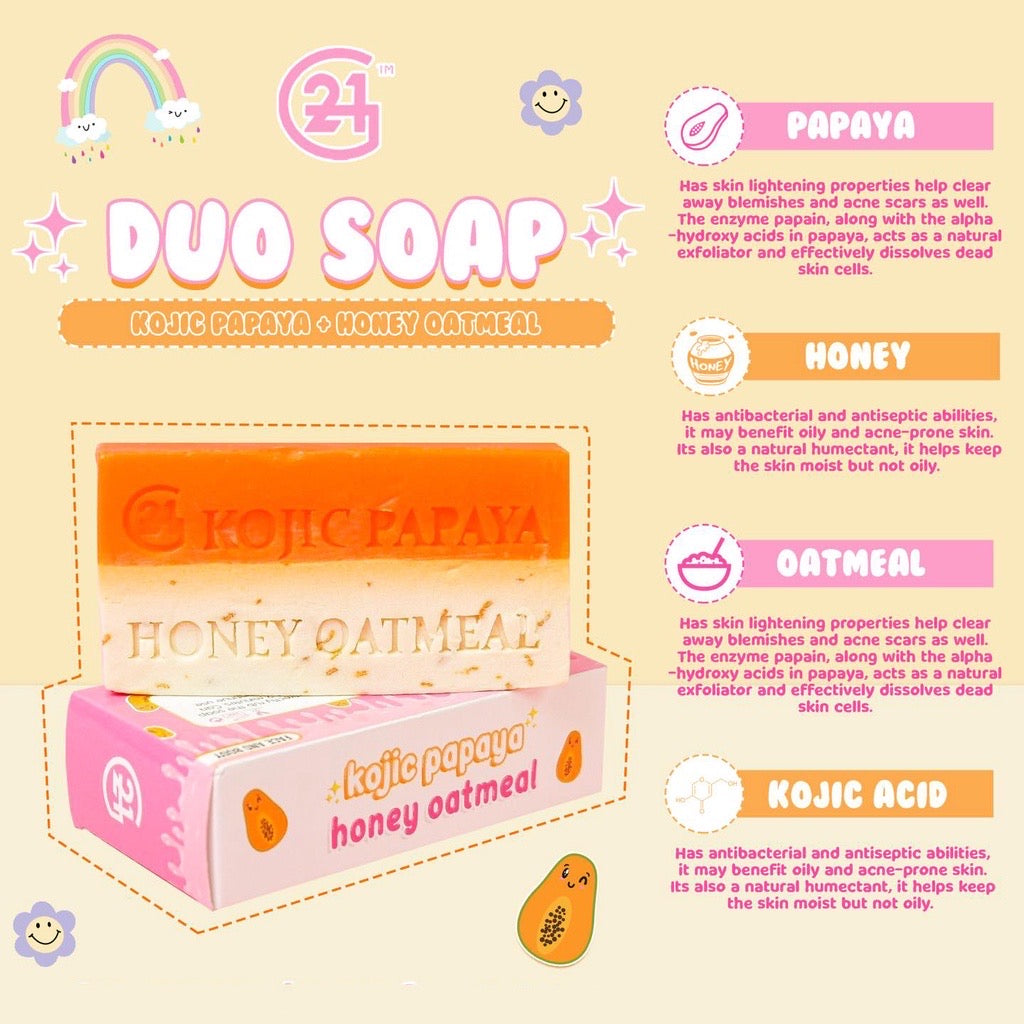 G21 Duo Soap is made with love from KOJIC which helps lighten skin, PAPAYA that has vitamin A and papain enzyme and OATMEAL & HONEY that is effective and a natural remedy for skin lightening and brightening.