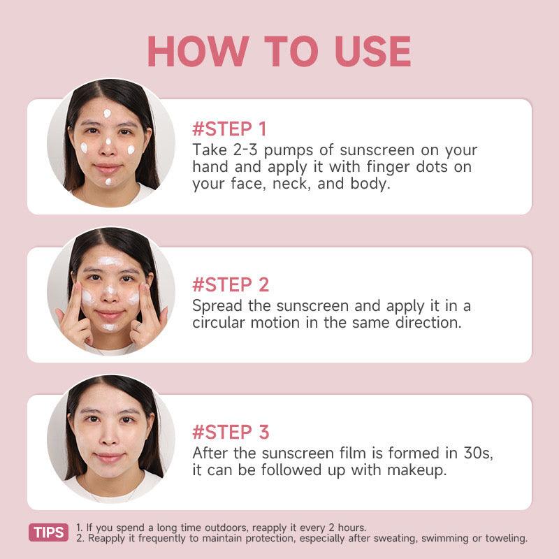 Tips: If you are outdoors for a long time, reapply every 2 hours. Reapply regularly to maintain protection, especially after sweating, swimming or wiping. With towel. with towel. with towel.