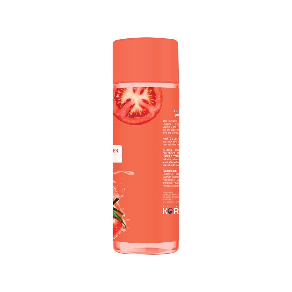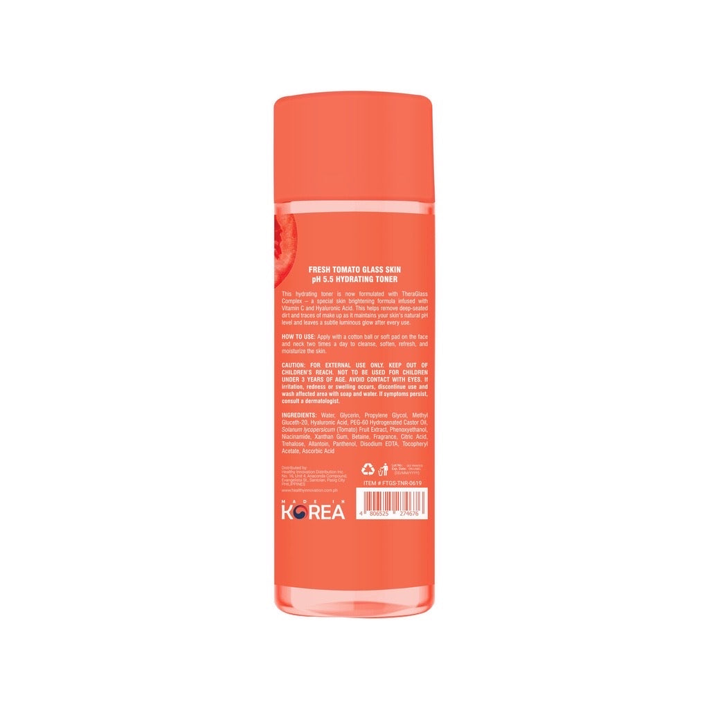 Fresh Tomato Glass Skin pH 5.5 Hydrating Toner removes excess dirt, traces of oil and make up. Its tonic benefits are to balance the pH of your skin, deep clean, tighten pores, make skin smoother, whiter and appear firmer, making it look naturally healthy and glowing.
